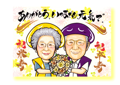 金婚式の似顔絵を描いて頂いたんですが両親に似ていて いい似顔絵にして頂きました。 フレームも良かったです。似顔絵のタッチがとても優しいものだったので決めました。 金婚式の両親への贈り物で描いて頂きましたが、とても良い感じに描いて頂き両親もとても喜んでいました。