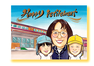 大まかな構図とプレゼントに対する想いを伝えただけですが、それを汲み取って、素敵な絵を仕上げてくださいました。退職祝いでしたが、職場の雰囲気もよく出ていて、記念になると喜んでくれました。
