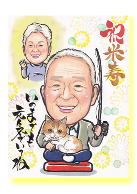 父の米寿のお祝いに、似顔絵をプレゼントで送りました。亡くなった母、愛猫、趣味が釣りだったので、釣竿をプラスで描いてもらいました。予算オーバーにはなってしまいましたが、父は大喜びしてくれ、初めて父の涙を見ました。なかなか感動を与えてあげることは出来ませんが、今回、なつみかんさんの似顔絵で、父が感動してくれたことは間違いありません。こちらにお願いして、良かったです。ありがとうございました。
