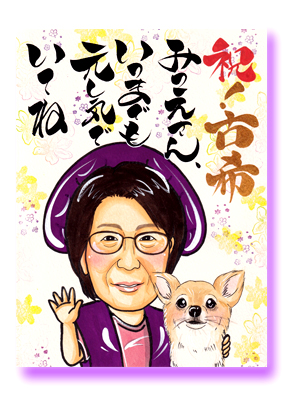 母の古希のお祝いで愛犬とともに描いていただきましたが、あたたかいタッチの絵で喜んでもらえてとても良かったです。インターネットに掲載されていた絵の例がとても良かったのでこちらを選びました。 機会がありましたらまたお願いしたいです。