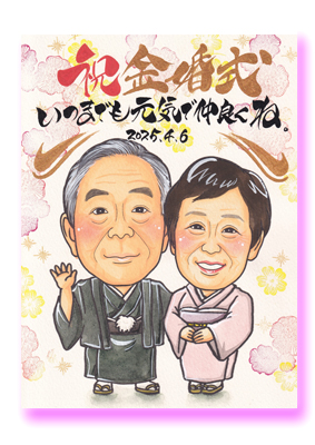 金婚式の似顔絵を描いて頂いたんですが両親に似ていて いい似顔絵にして頂きました。 フレームも良かったです。似顔絵のタッチがとても優しいものだったので決めました。 金婚式の両親への贈り物で描いて頂きましたが、とても良い感じに描いて頂き両親もとても喜んでいました。