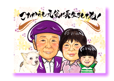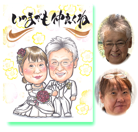 ありがとうございました。父の米寿祝に、父と母の似顔絵をお願いしましたが、注文通りに、仲睦まじく温かみのある作品が届きました。弟妹達も感動していました。両親には、この額をお守りに長生きして欲しいなぁと思っています。