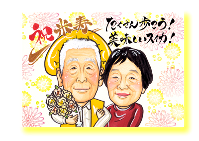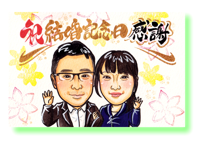 | 似顔絵は、特徴を的確に捉えていて、とても満足のいく出来栄えでした。服装も、金婚式にふさわしいような落ち着いたものに仕上げでくれて良かったです。ポエムとの組み合わせというのは、とても良いと思いました。家族も皆大満足でした。また画像ファイルを後で頂けるのも、大変気が利いていてうれしいです。両親との家族LINEの壁紙になっております。