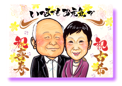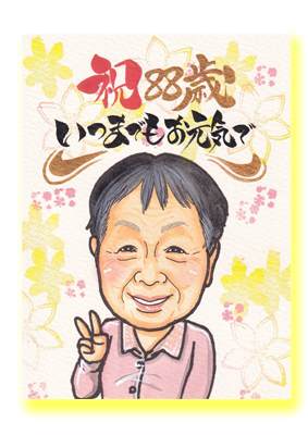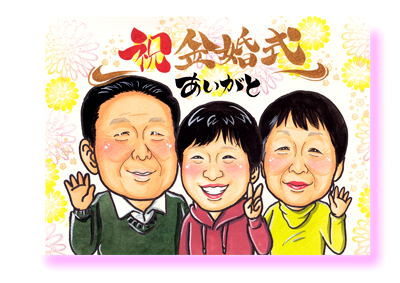 | とても良く出来ていました。両親の金婚式に贈る似顔絵を依頼したのですが、「両親に打掛と紋付袴を着せたイラストに仕上げて欲しい」というリクエストにも応えていただき、両親も「一生の記念になる」と喜んでいました。温かいお祝いの席に、花を添えていただき、感謝しています。