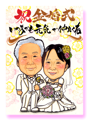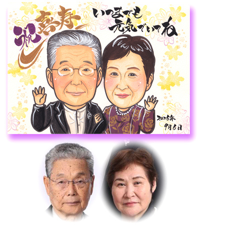 | 似顔絵は、特徴を的確に捉えていて、とても満足のいく出来栄えでした。服装も、金婚式にふさわしいような落ち着いたものに仕上げでくれて良かったです。ポエムとの組み合わせというのは、とても良いと思いました。家族も皆大満足でした。また画像ファイルを後で頂けるのも、大変気が利いていてうれしいです。両親との家族LINEの壁紙になっております。